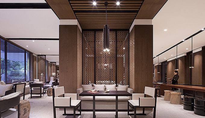 成都酒店设计公司称大堂选用对称的计划办法,传达出新中式的次第美学。简练的线条则充溢现代时尚感,在演绎传统的一同,也更加符合现代人的审美办法。书吧、茶馆使用了纹路清雅的木质资料,镂空屏风与光影互相照顾,散发着素雅的东方气质。